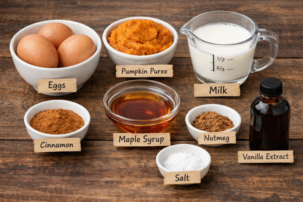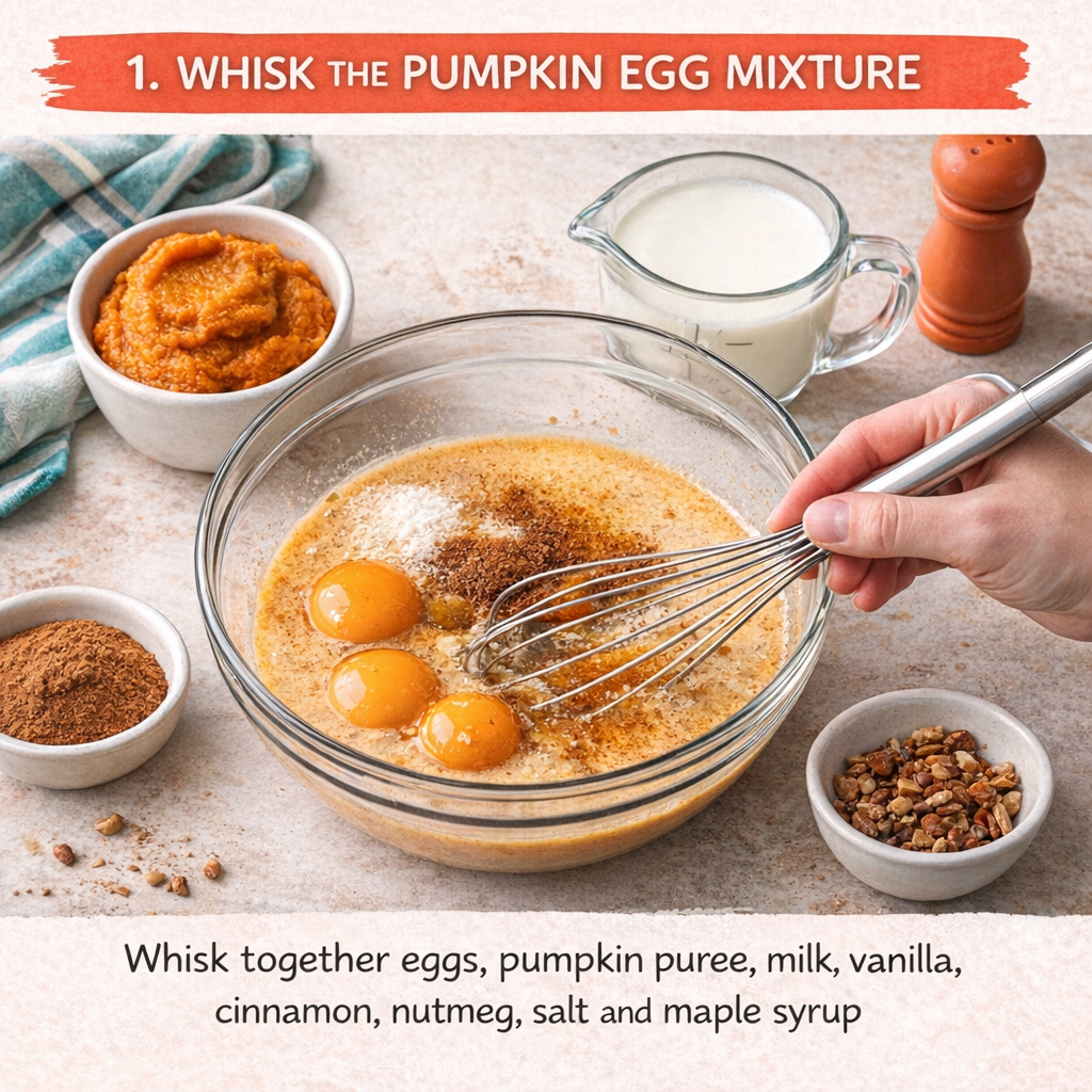 - In a large mixing bowl, whisk together the eggs, pumpkin puree, milk, vanilla extract, cinnamon, nutmeg, salt, and maple syrup. Whisk it thoroughly until smooth—no lumps allowed!